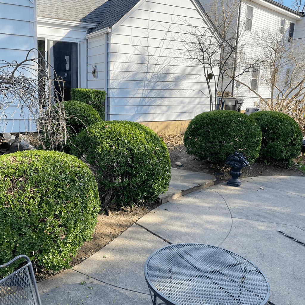 - Boxwoods, yew bushes, and other shrubs trimmed shapped for a clean tidy look